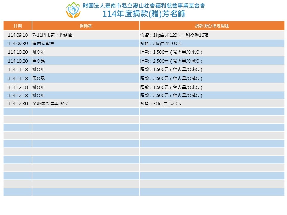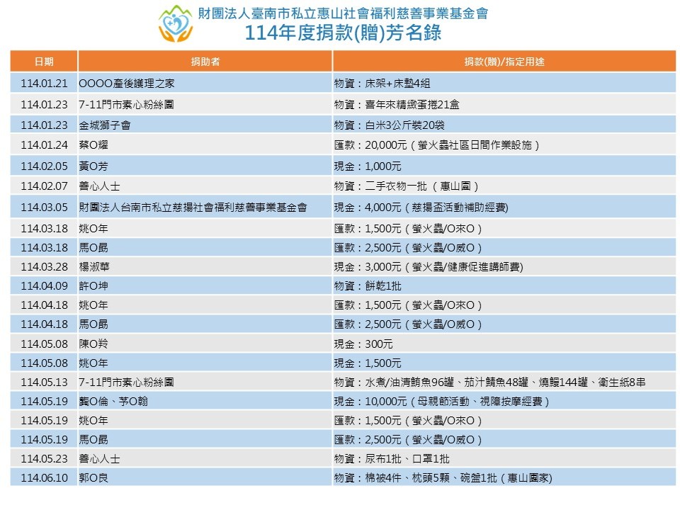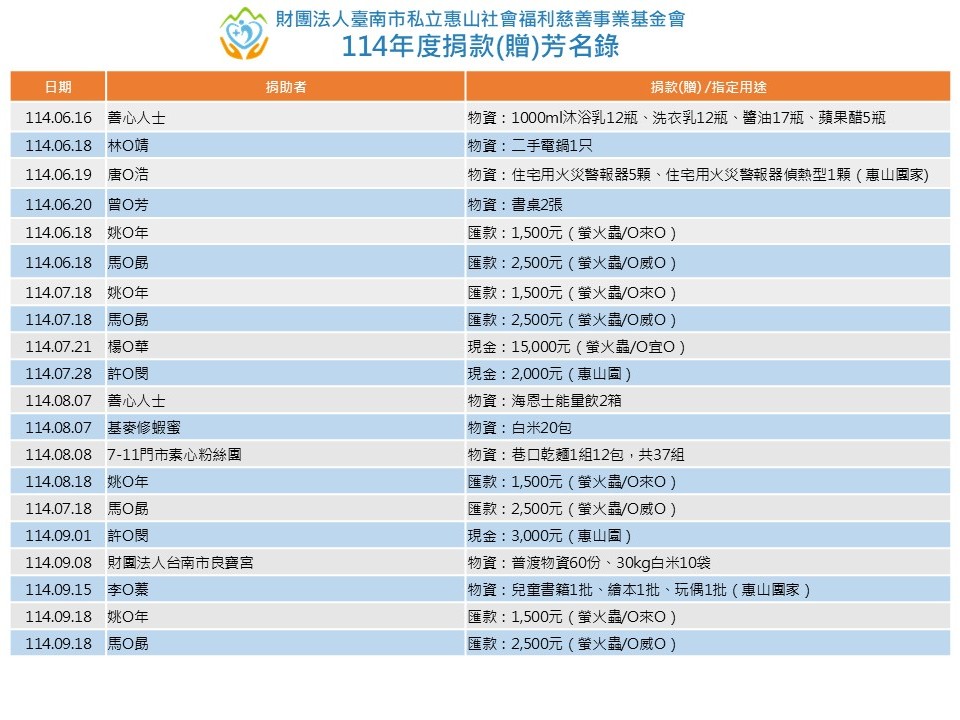 .版權所有:財團法人臺南市私立惠山社會福利慈善事業基金會.瀏覽人數:214493 .本會地址:(70061)台南市臺南市中西區西賢一街270號 .聯絡電話: 06-259-1717.傳真電話: .IE7.0,Firefox.20以上版本.最佳螢幕解析度 1024x768 |隱私權宣告|資訊安全政策|